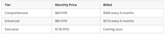 Members pay a fixed monthly fee starting at $60 KYD and receive:
